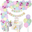 - Composition : ballons ronds, ballon licorne, ballon étoiles, ballon arc-en-ciel, bannière de fanions, cake topper, banderole "Happy Birthday", nappe de table motifs licorne