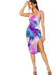 Robe coupe droite blanc et fuchsia sans manche avec un grand imprimé de licornes 3D au devant. Elle a un col carré, une coupe droite avec une fente et une longueur qui va au-dessus des genoux.