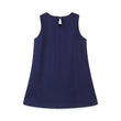Robe légère bleu nuit uni sans manche avec une coupe évasée, une encolure arrondie, une découpe goutte boutonnée dans le haut du dos et 2 fausses poches imprimées d'une licorne placée au devant.