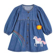 Robe large en jean avec une coupe évasée, une encolure arrondie, des manches trois quart, des poignets élastiques et une ouverture boutonnée au devant qui facilite l'enfilage. Un soleil, une licorne et un arc-en-ciel sont imprimés au devant de la robe pour lui donner de la couleur.