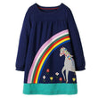 Robe en coton avec une coupe évasée et large, une encolure arrondie, des manches longues ballon et froncée au niveau de la poitrine. Le devant de la robe montre un grand arc-en-ciel, des imprimés floraux et un motif de licorne.