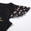 - Pour bébé : un body à manches courtes à imprimés étoiles et à encolure arrondie, avec 3 boutons pression et les mêmes franges à la base.