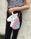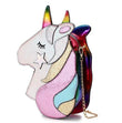 Ce sac à main prend la forme d'une tête de licorne kawaii. De jolies couleurs arc-en-ciel et un aspect brillant.