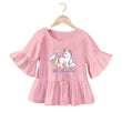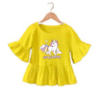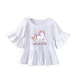 Top à offrir en guise de cadeau d'anniversaire à une petite fan de licorne. Il a une coupe large, un col rond, des manches courtes larges avec des volants et une base volantée également. Une licorne blanche avec une crinière et une queue multicolore est posée au devant pour casser la couleur unie du top. Léger, souple et confortable, il se porte par temps chaud. Vous pouvez l'associer facilement avec un pantalon, un short ou une jupe.