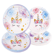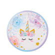 Assiette licorne décor floral. Un lot de 8 assiettes rondes et plates jetables avec des décors floraux et une jolie licorne dorée placée au centre de chaque assiette.
