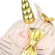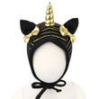 Ce bonnet agrémenté de nœuds et de rayures dorés saura mettre un sourire sur toutes les lèvres des petits et grands, fan de licorne.