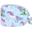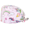 Sur fond bleu et rose, ce bonnet médical est ornementé de motifs imprimés représentant entre autres une licorne au style dessin animé arborant une belle crinière en arc-en-ciel, pour un effet des plus sympathiques.