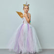 C'est une robe deux tons composée d'un bustier en filet blanc doté de deux bretelles satinées blanches à bande large et d'une jupe longue en tulle multicolore avec des tonalités pastels. Au devant, nous retrouvons un imprimé licorne avec une couronne de fleurs de différents coloris pour former la frange de la licorne. Une tenue accompagnée d'un serre-tête licorne pour couronner comme il se doit toutes les princesses.