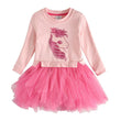 Ensemble comportant une robe tutu et un collant. La robe tutu a une encolure arrondie et des manches longues régulières. Nous retrouvons au devant du haut de la robe un bel imprimé licorne. Le tutu est composé de quatre bandes de froufrous superposées conçus en tissu voilage gris parsemé d'étoiles dorées.
