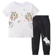 Au devant nous retrouvons deux licornes et des étoiles. Il existe en deux coloris : rose et blanc. Un jogging noir accompagne le t-shirt. Avec une taille élastique et deux poches au devant ainsi que des bords côtes aux chevilles. Un imprimé licorne blanc et une étoile sont posés sur le côté droit, au niveau des genoux pour casser la couleur noire du jogging. Cet ensemble licorne sweat & pantalon à noeud fille vous intéressera également. Et pour agrandir la garde robe de vos enfants, n'hésitez pas à jetter un oeil sur ces ensembles vêtements licorne. Pour vous relooker comme une licorne de la tête aux pieds des idées géniales et originales vous attendent sur notre grande collection de vêtements licorne.
