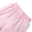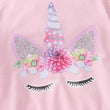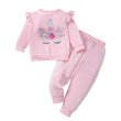 Le haut est un sweat sans capuche avec un col arrondi, des bords côtes aux poignées et à la base et de jolis volants fantaisies aux épaules. Au devant du sweat nous retrouvons un bel imprimé licorne. Un jogging avec une coupe large, un maintien élastique à la taille et des bords côtes à la cheville est associé à ce sweat. Pour casser le rose, une bande blanche verticale est placée sur les deux côtés extrêmes du jogging, à partir de la taille jusqu'à la cheville.