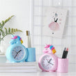 Réveil licorne avec un rangement stylos utile pour stocker vos fournitures scolaires en plus d'agrémenter votre bureau.
