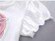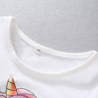 Robe qui tourne bi-matière constituée d'un haut blanc en jersey pur coton, avec un col rond et des manches courtes bouffantes à volants fantaisie. Le jupon est en tissu voilage multicolore généreusement volanté qui nous rappelle le monde enluminé des licornes.