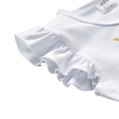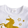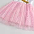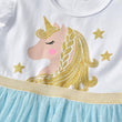 Robe qui tourne avec une coupe évasée, un col arrondi et des manches courtes volantées fantaisie. Cette robe est constituée de 2 parties différentes : le haut est en coton de couleur blanc uni et montre une licorne dorée au devant. La partie inférieure est un jupon en tissu voilage.