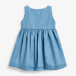 Robe licorne en jean bleu souple avec une coupe large et ample, sans manche, un col rond et une ouverture boutonnée au devant.