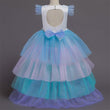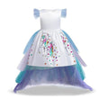 Si vous recherchez un déguisement licorne à la hauteur de vos attentes, optez pour cette robe de princesse licorne au style moderne et girly ! Elle a une encolure ronde, ne comporte aucune manche, a des volants fantaisies en tulle bleue aux épaules, est dotée d'un beau bustier blanc en soie avec une coupe droite et ajustée, d'un dos nu avec une fermeture boutonnée juste en-dessous de la nuque pour faciliter l'enfilage et enfin d'un beau noeud centré juste au niveau de la taille à l'arrière. Elle a également une taille froncée et un beau jupon en soie dont l'ensemble est parsemé de grands et beaux imprimés licornes avec des trainées d'étoiles filantes multicolores. Quatres rangées de volants multicolores sont cousues à l'arrière du jupon pour former une belle traîne.