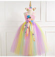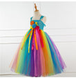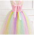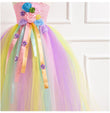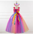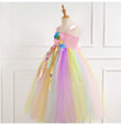 Cette robe longue est le costume qu'il vous faut si votre fille souhaite incarner une princesse licorne à l'occasion d'une soirée déguisée ou pour le Carnaval. Elle a un col carré et est dotée de deux bretelles en soie. Le buste de la robe est en dentelle et a une coupe droite. Celui-ci est orné de jolies roses conçues avec de la soie et une longue trainée de rubans satinés multicolores est aussi centrée au devant au niveau de la taille, ce qui apporte encore plus de grâce à la robe. Le jupon quant à lui est en tulle multicolore et a une coupe évasée, ample et longue. Et pour couronner le tout, deux accessoires clés viennent compléter la robe : une paire d'ailes multicolores et un serre-tête licorne, de quoi ravir votre petite princesse.