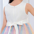 Robe bi-matière composée d'un haut blanc en molleton léger et d'un jupon conçu en tissu voilage aux couleurs irisées dont l'ensemble est parsemé de grosses étoiles argentées. Sa coupe est évasée et patineuse, elle a un col arrondi et ne comporte pas de manche. Au devant, nous retrouvons un grand imprimé licorne sequins. A l'arrière se trouve une fermeture zippée pour faciliter l'enfilage. Une belle robe licorne qui va mettre plein d'étoiles dans les yeux de votre princesse.