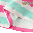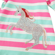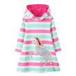 Robe en coton à rayures bleu turquoise, blanc et fuschia. Elle est large et fluide avec une coupe évasée, une capuche et des manches longues régulières. Le devant montre le motif d' une licorne couverte de paillettes argentées.