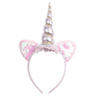 Ce serre-tête est doté d'un demi cerceau en plastique enveloppé de tissu très doux. Il est surmonté d'une corne de la licorne et de deux oreilles toutes tapissées de sequins réversibles. Au centre est placé un tissu voilage rose pâle en guise de frange. Un accessoire de taille qui va apporter une touche de magie à votre tenue.