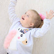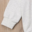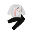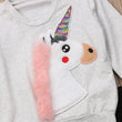 Ensemble composé d'un joli pull gris avec un motif de licorne et d'un pantalon bleu uni avec deux bandes roses de châque côté.