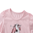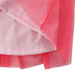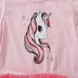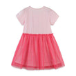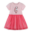 Robe avec une coupe évasée, des manches courtes et un col rond. Le haut de la robe est en coton pur jersey qui montre une jolie licorne à crinière rose tandis que son jupon est en tulle couleur fuschia avec une doublure en coton en dessous. Ce qui donne à la robe un aspect bi-matière. Des fronces marquent la taille cintrée de la robe.