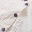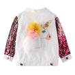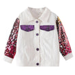 La seule veste blanche licorne. Les plus sont sa matière jean et les sequins sur les manches et les poches. Une veste blanche et brillante. Le motif de tête de licorne est bien visible dans le dos de la veste.