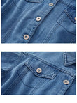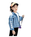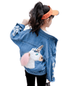 Une veste en jean bleu avec un motif de licorne 3D aux détails irisés au dos. De petites paillettes avec des reflets colorés forment des mots et sont imprimés sur les manches.